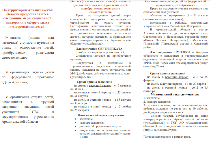 Организация отдыха и оздоровления детей: https://dvinaland.ru/gov/iogv/minobr/otdykh-deti/#cookies=yes