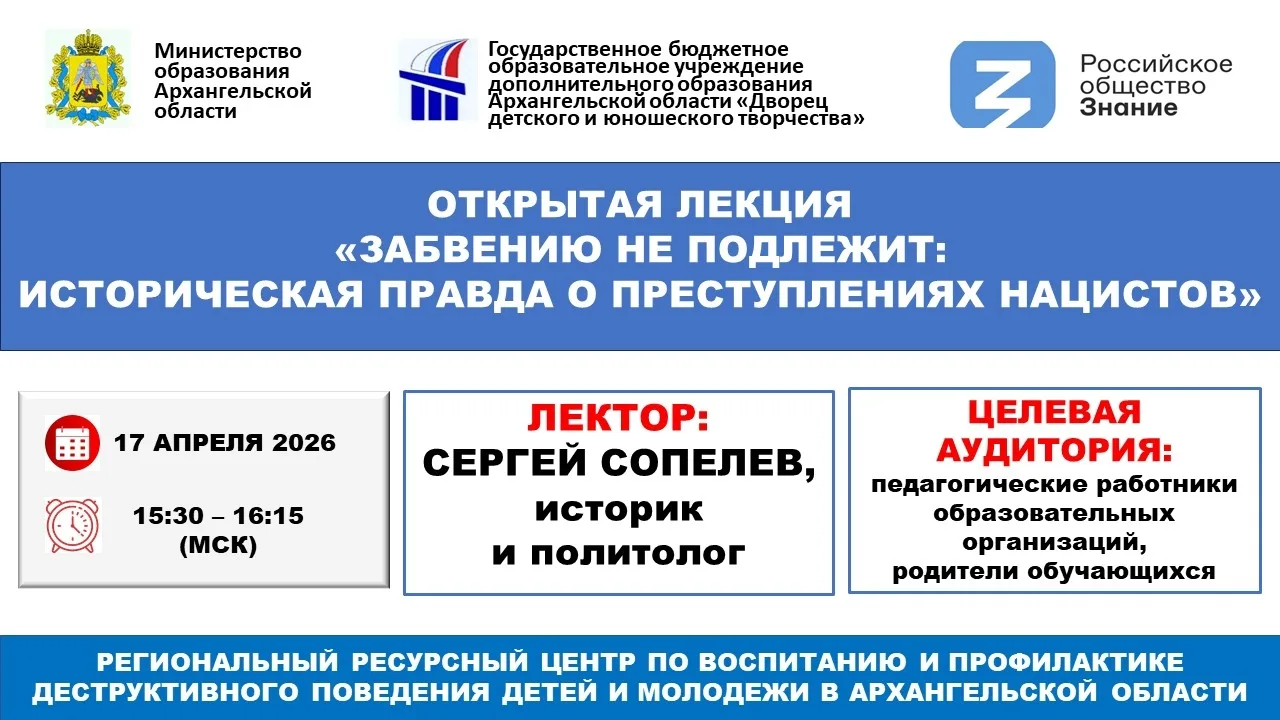 17 апреля 2026 года министерство образования Архангельской области совместно с филиалом Российского общества "Знание" в Архангельской области и Региональным ресурсным центром по воспитанию и профилактике деструктивного поведения детей и молодежи в Архангельской области проводят онлайн-лекции по теме: "Забвению не подлежит: историческая правда о преступлениях нацистов".